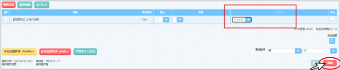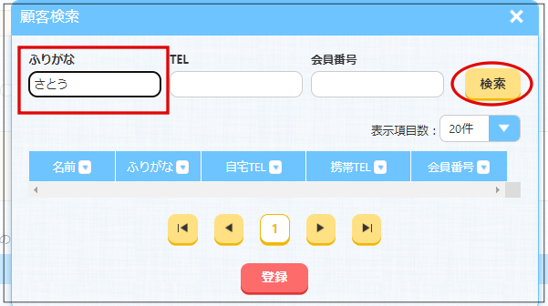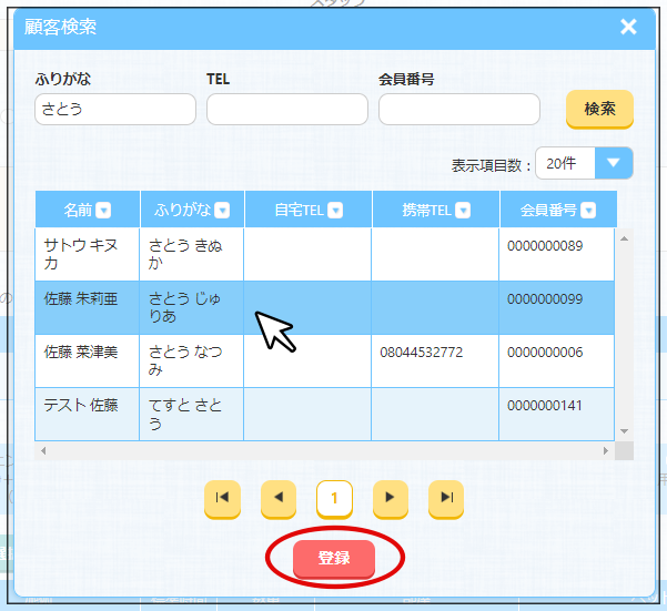 ⑤検索結果より、予約したいお客様を選択後、登録をクリック。