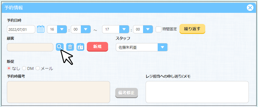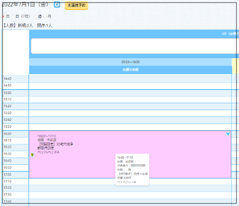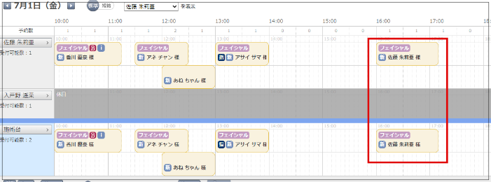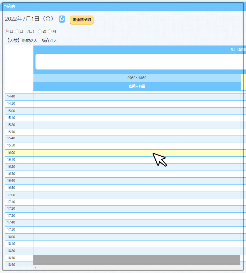 予約表から担当する施術者の開始時間の枠をクリックする。