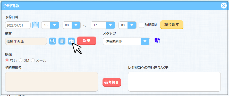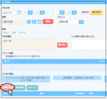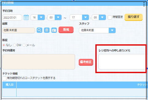 ⑧予約情報画面に戻ったら、「レジ担当への申し送り/メモ」に