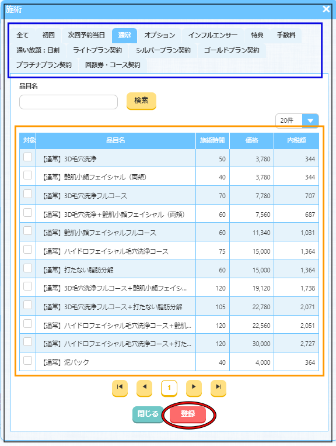 ⑩青枠の分類欄から、施術メニューを選択して登録ボタンをクリックする。
