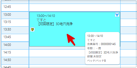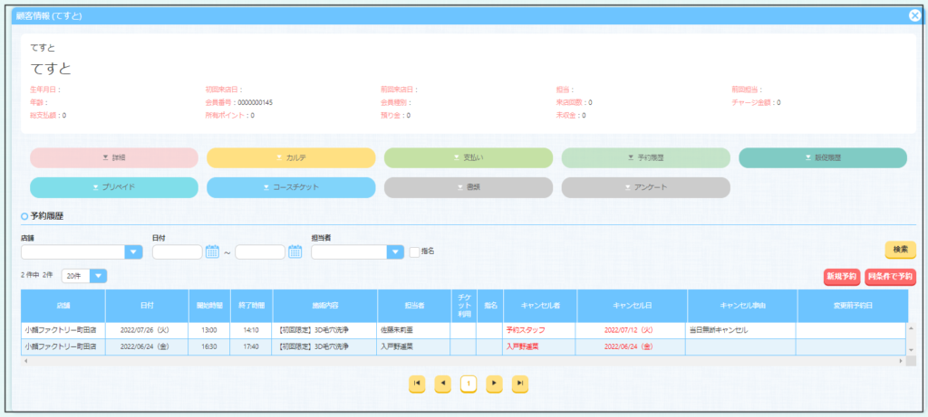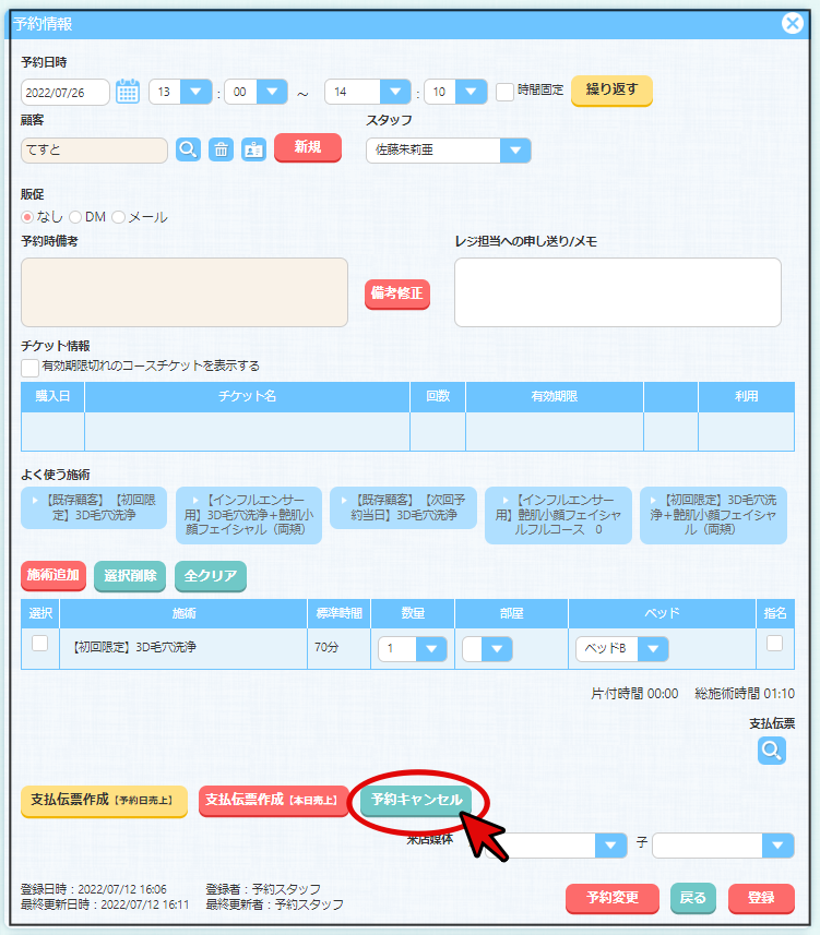 赤字のキャンセル日はキャンセル料が未払いの予約です。日付を押すことで、キャンセル料を取らない登録もしていただけます。