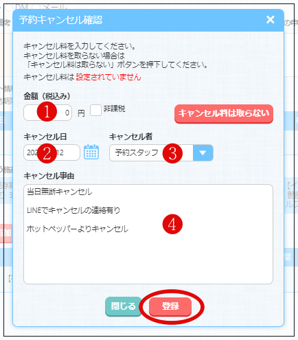 (例)当日無断キャンセル / LINEでキャンセル / ホットペッパーよりキャンセルなど