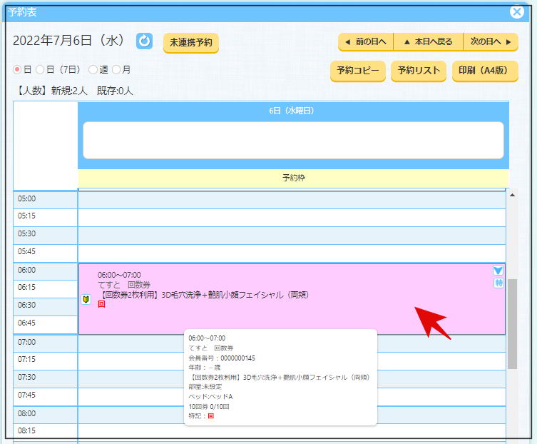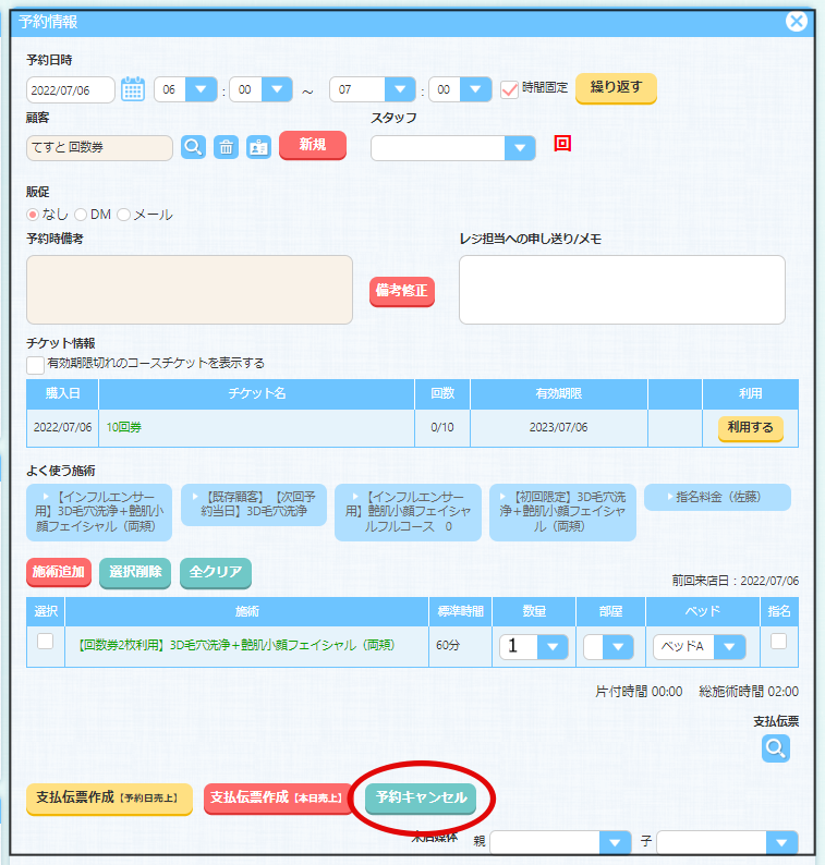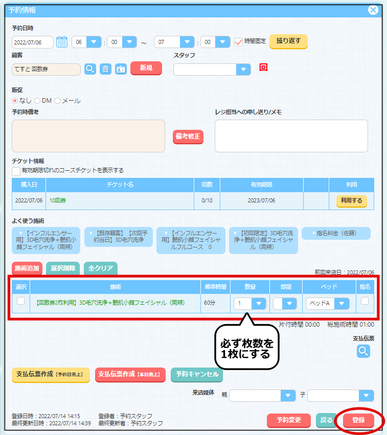 2.当日キャンセルの場合のみ、施術内容を確認し、チケット枚数を1枚にして再登録する。