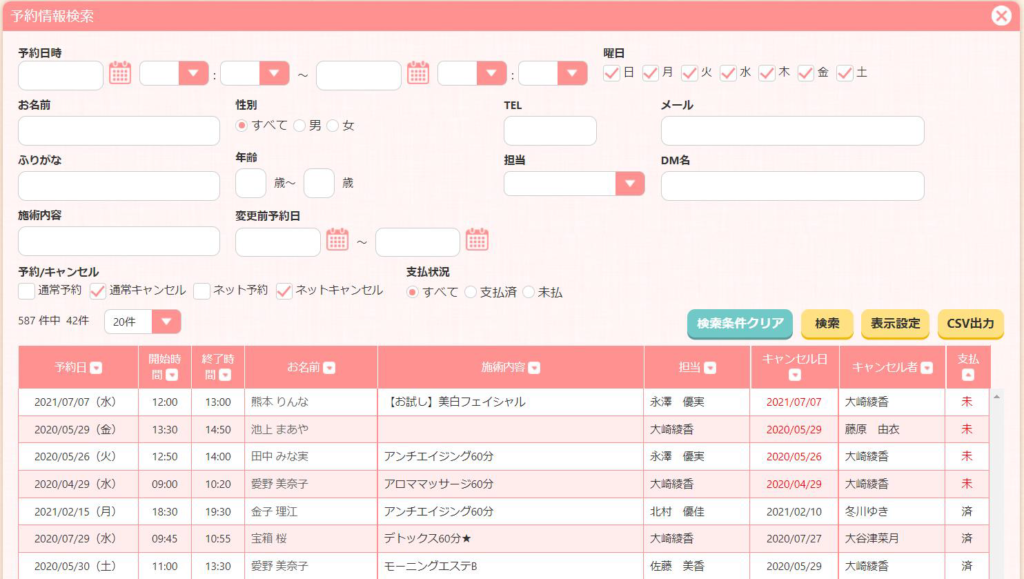赤字のキャンセル日はキャンセル料が未払いの予約です。日付を押すことで、キャンセル料を取らない登録もしていただけます。