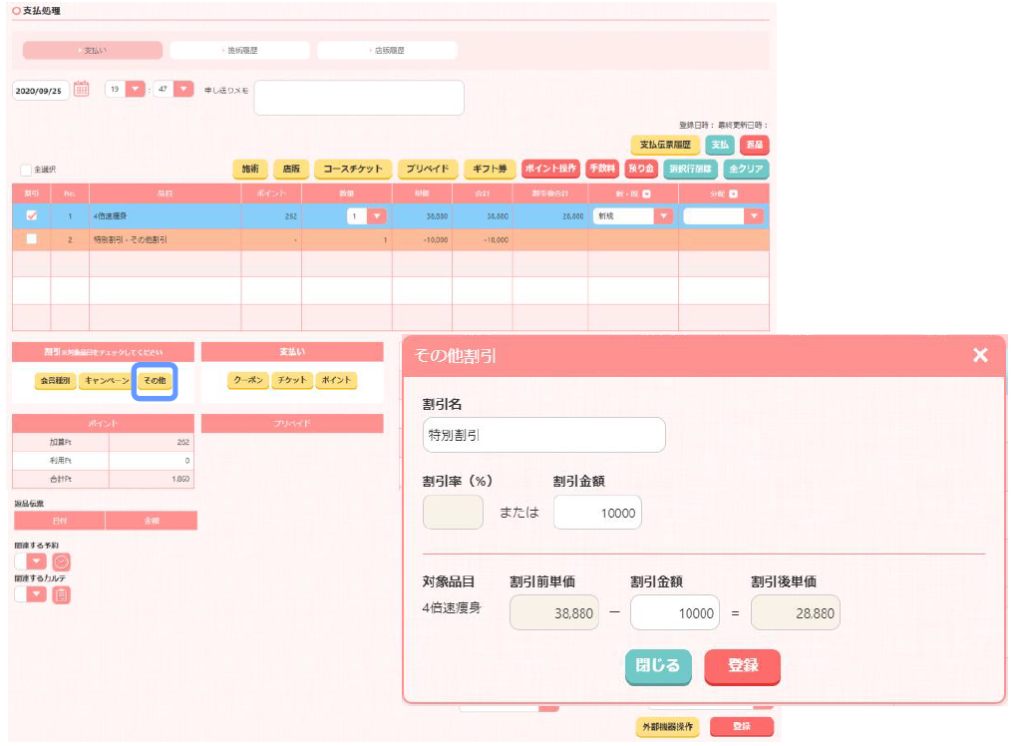 2. 「その他」ボタンを押すと一時的に割引をすることができるため