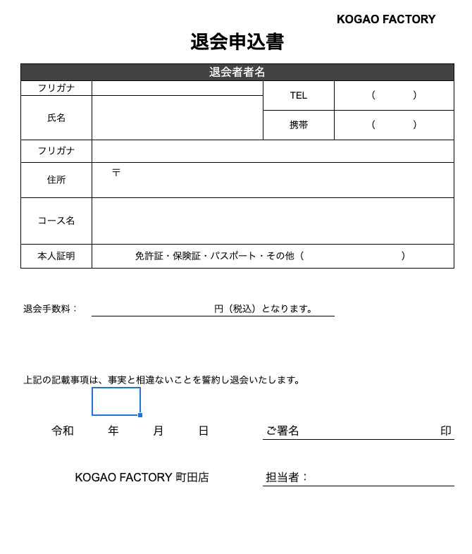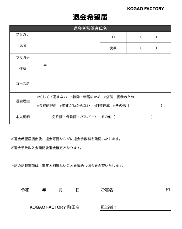 ※この際にあくまでも申出書であり、消化金額+解約手数料をお支払いいただき解約が完了になること、金額の算出は一度本部での確認が入るためわかり次第ご連絡させていただき決済と解約の手続き日を決めさせていただくことをお伝えする
